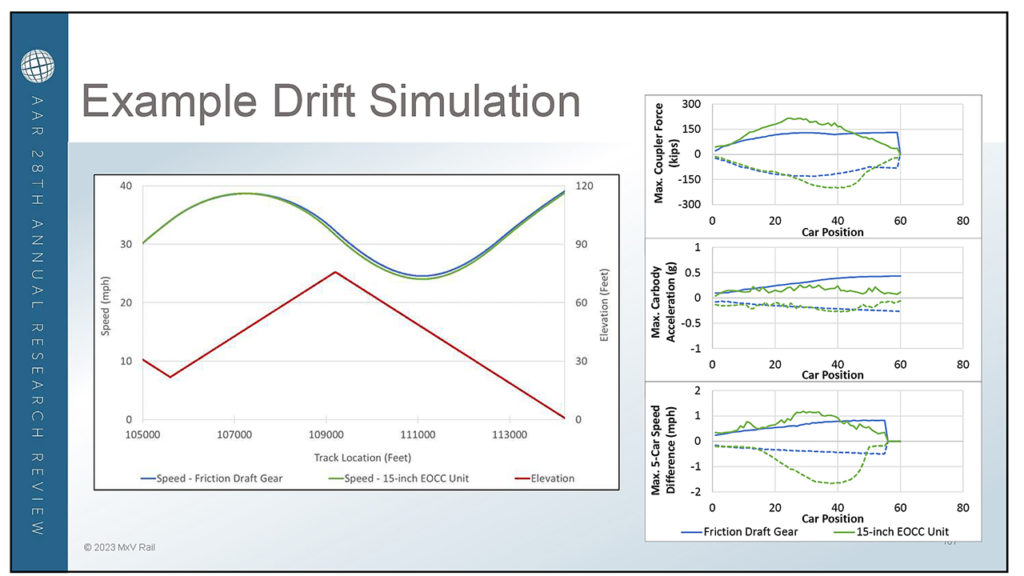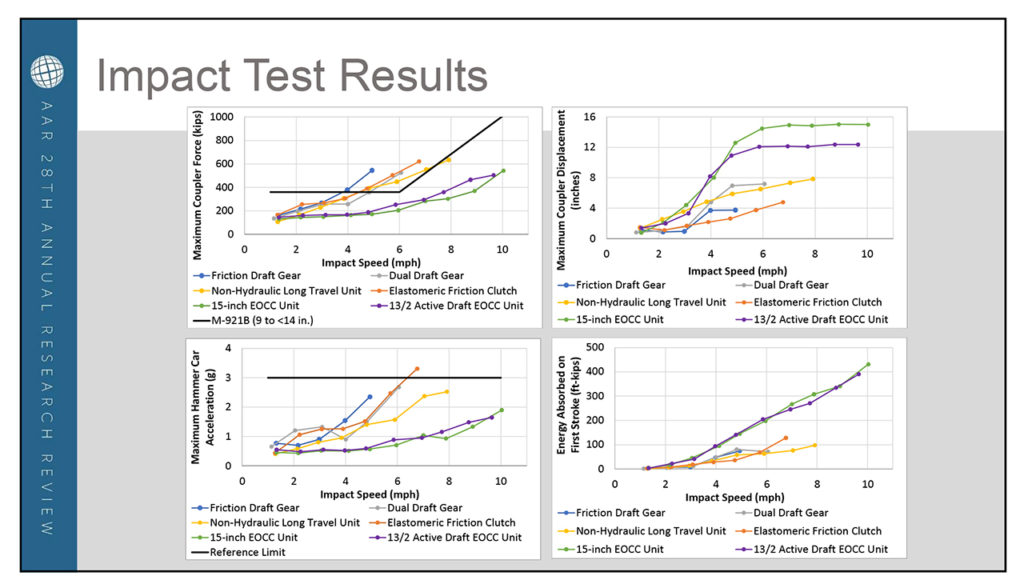 “The results show that EOCC units generally provided less train action control,” Klopp reported. “Higher speed differences and forces develop. Friction draft gears and alternative units generally provided better train action control, with limited relative motion and forces. Impact tests showed EOCC units provided the most impact protection, while standard DGs provided the least. Standard DGs provided the most slack control, while EOCC units provided the least. Alternative draft systems provided better impact performance than DGs but with a smaller displacement than EOCC units.”