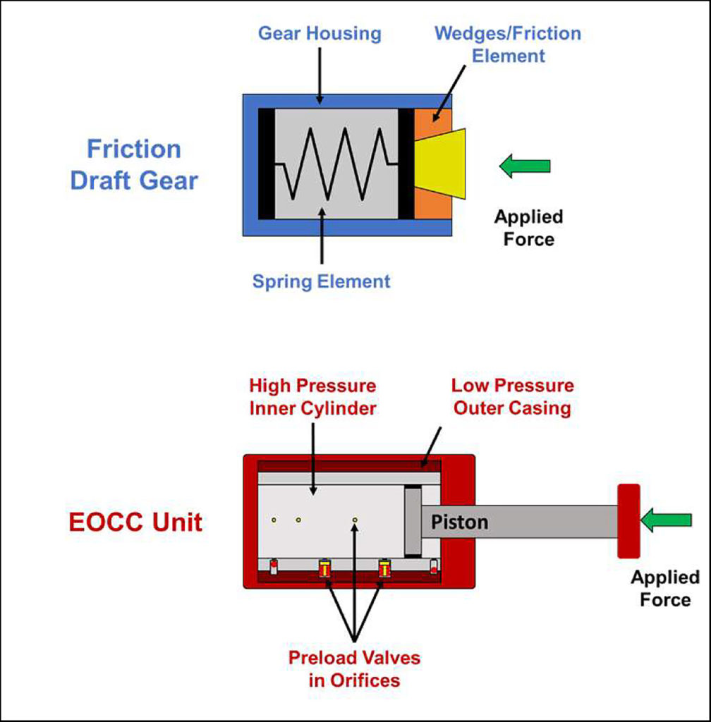 The End-of-Car Energy Management Task Force’s objectives, Klopp noted, “are assisting the industry in reducing service disruptions from component failures, broken coupler knuckles and train separations. Improved draft system performance provides better impact protection and control of in-train forces, limiting train slack action. Draft systems protect railcars and lading from coupler forces in a train by limiting relative motion, absorbing impact energy.” The most common draft systems are friction draft gears (DG), which have a short-displacement stroke and provide “good control of train slack action,” and end-of-car cushioning (EOCC) units, which have long-displacement stroke and provide “good energy absorption in yard impacts.”