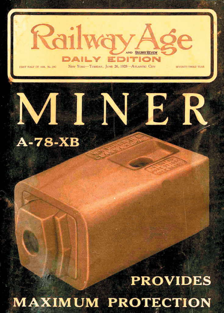 Back in the day, when the cover of Railway Age (then a weekly and sometimes a daily during industry trade shows) was available to advertisers, Miner’s products were often showcased. The June 26, 1928, cover featuring the company’s A-78-XB draft gear is just one example: