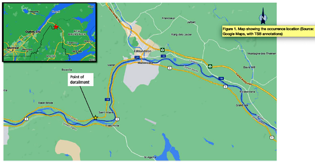 The derailment of CN train M30631-25, which occurred about 13 km (8 miles) southwest of Edmundston at Mile 8.04 of the Pelletier Subdivision, involved 22 of the 171-car train. Eight of the derailed cars were LPG (liquefied petroleum gas) tank cars, three loads and five empties. There was no fire, and no injuries were reported. No LPG was released. M30631-25 consisted of three head-end locomotives , two DP (distributed power) locomotives at positions 126 and 127 in the consist, and 171 mixed freight cars. The 11,786-foot (2.23-mile)-long train weighed 17,787 tons.