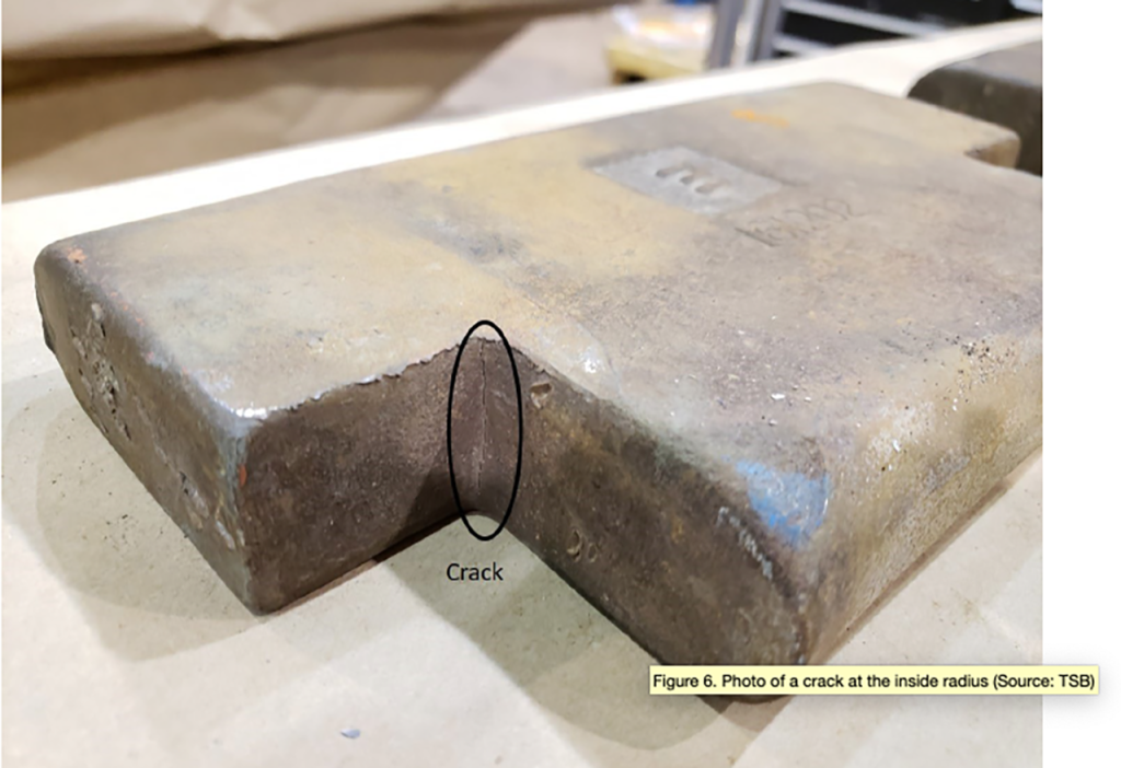The failed draft key had developed fatigue cracks at the inside radii, “which likely occurred over its four years of service before the derailment,” TSB noted. “It is likely that the design of the specific [draft] key contributed to the initiation and propagation of the fatigue cracks.”