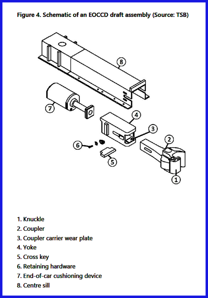 The investigation also identified that “there is no prescribed interval for the inspection of [draft] keys installed on railcars equipped with long-travel hydraulic end-of-car cushioning devices (EOCCDs), like those involved in this occurrence,” TSB said. “[Draft] keys generally remain in service for many years, and are only replaced when they are worn beyond set limits or develop a condemnable defect. [Draft] keys in EOCCDs are not easily accessible for inspection in the field due to the design of EOCCDs. Consequently, they are usually only inspected when work takes place on the draft assembly.”