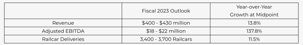 “Market demand for our railcars remains strong,” said FCR CFO Mike Riordan. “While new orders were lower than anticipated for the quarter, this was primarily a function of timing. With our order backlog fully booked for 2023, we are raising our previously stated full year Adjusted EBITDA guidance range from between $15 million and $20 million to between $18 million and $22 million. Despite foreign currency headwinds alongside the broader macro environment, we are making great progress in improving our margins. Increased profitability combined with our robust backlog and a stronger balance sheet, FCA is positioned to execute as we head into the second half of the fiscal year and beyond.”