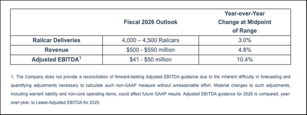Mike Riordan, Chief Financial Officer, added, “2025 demonstrated the durability of our operating model. We made continued progress strengthening the quality and consistency of our cash flows while maintaining a disciplined approach to capital allocation. During the year, we also advanced our aftermarket strategy, including the addition of Carly Railcar Components, which enhances this growing part of our business and supports more stable, recurring revenue across market cycles. Looking ahead to 2026, our guidance reflects ongoing industry uncertainty while reinforcing our confidence in the underlying strength and resilience of the business.”