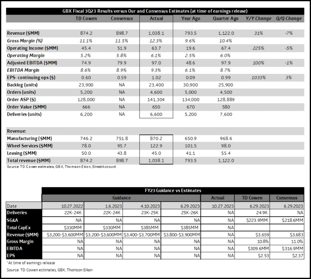 “GBX [Greenbrier] reported an impressive all-around beat to our and consensus estimates and raised guidance,” TD Cowen Transportation OEM Analyst and Vice President Equity Research Matt Elkott reported June 29. “Deliveries and gross margin exceeded expectations. While orders were somewhat below our estimate, after quarter-end, GBX received orders for a strong 7,900 units. FY23 delivery and revenue guidance are above our projections. We have higher confidence in our above-consensus FY23 and FY24 EPS estimates.