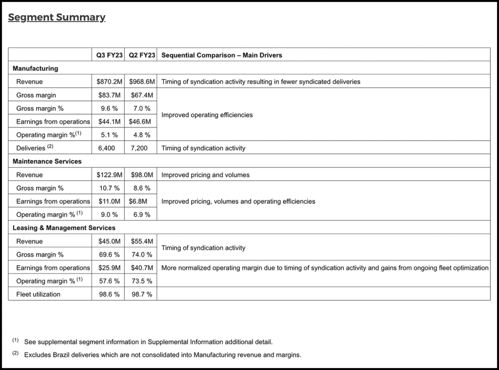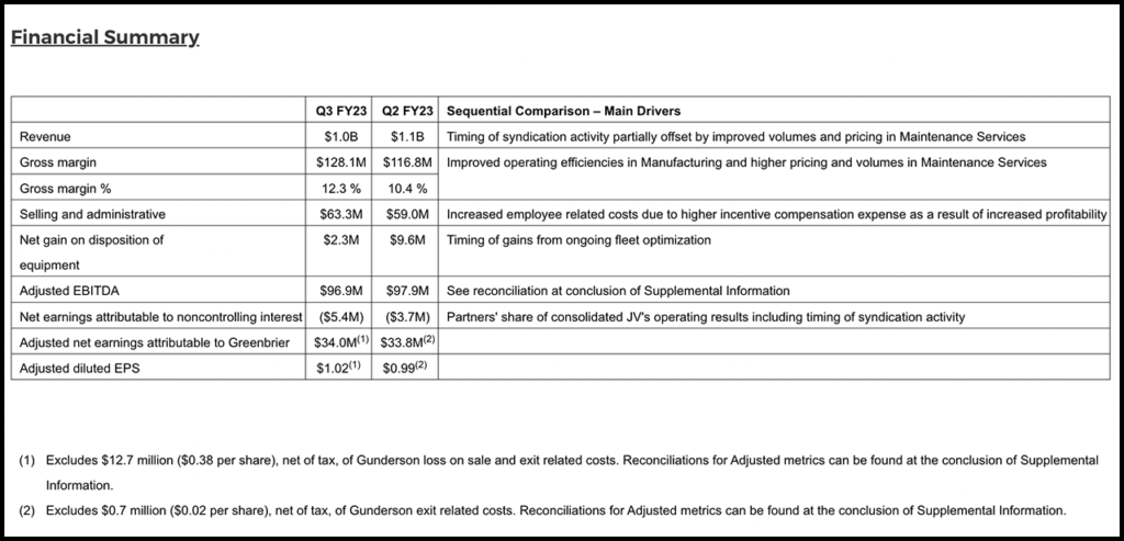 Following are Greenbrier’s third fiscal quarter 2023 highlights: