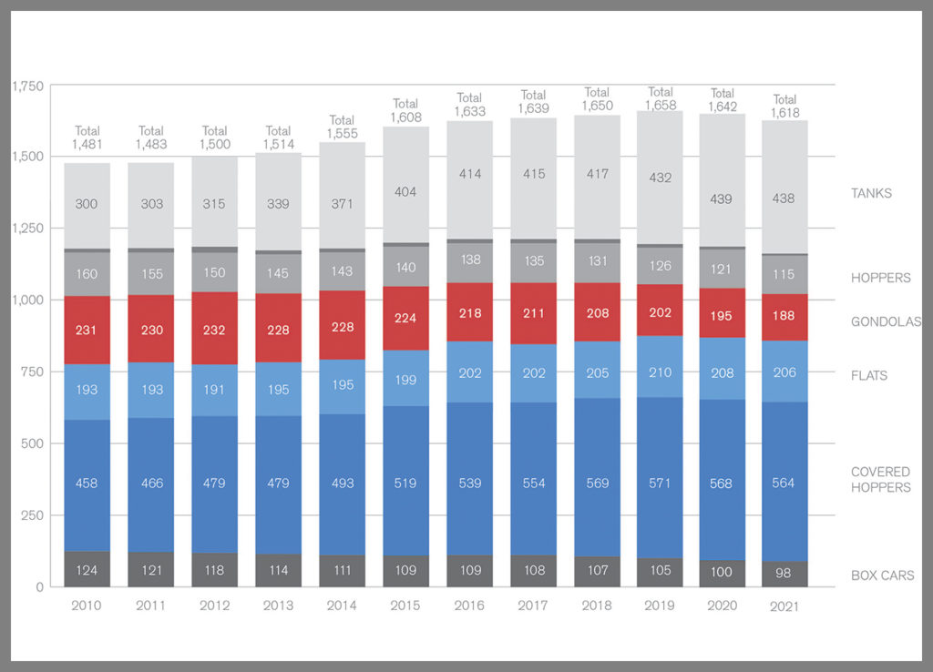 Hoppers primarily drove losses in the revenue-earning fleet, decreasing by 5.9% from 2020. Gondolas, flats and boxcars also fell in 2021, all decreasing by at least 1% from 2020. No car type recorded gains.