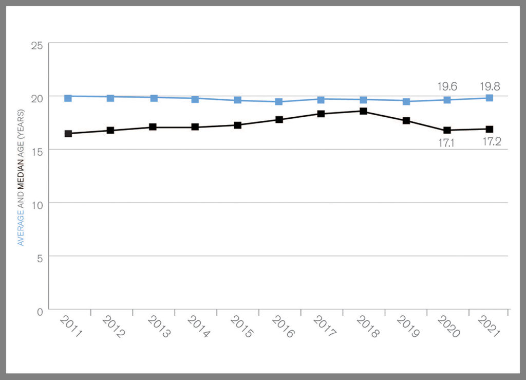 The average age of the revenue-earning fleet was up in 2021. The average age of the fleet increased to 19.8 years, suggesting new cars were joining the fleet at a slightly lower rate than older cars were exiting during the previous year.