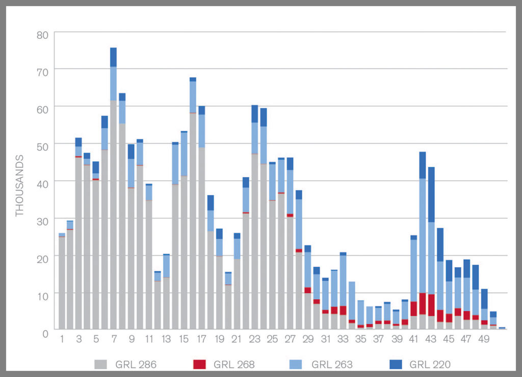GRL 286 cars dominate among recent additions to the fleet because they enable operational efficiencies that reduce costs and ease logistics challenges. The fleet continues to add GRL 263 and GRL 268 cars, but at a much lower rate than GRL 286 cars. 2021 marked the first year no GRL 220 cars were added to the fleet. The last year non-GRL 286 cars led among new additions to the fleet was 1992.
