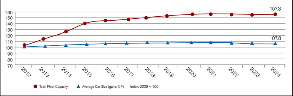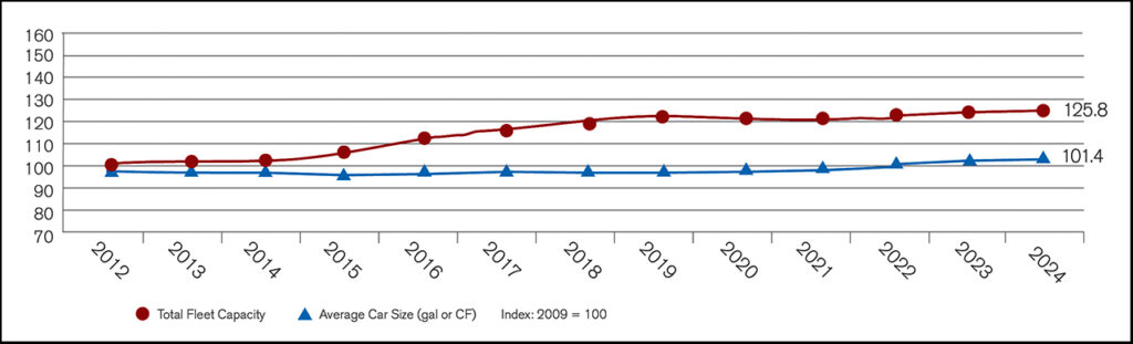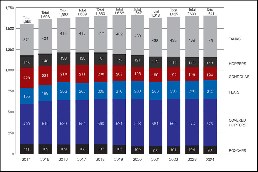 The North American railcar fleet grew in 2024. The total size of the revenue-earning fleet increased 0.2% from year-end 2023 to year-end 2024.