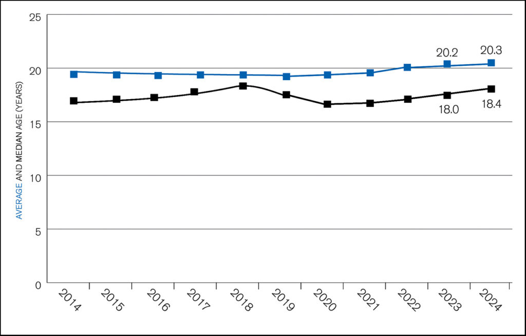 - The average age of the revenue-earning fleet continued to climb in 2024. The average age rose to 20.3 years—its highest in over a decade—continuing to suggest new cars were joining the fleet at a slightly lower rate than older cars were exiting last year.