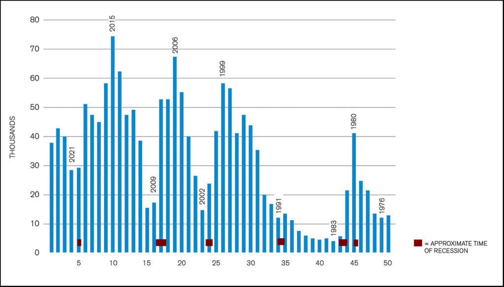 Railcars with a GRL of 286,000 pounds have made most of the new additions to the revenue-earning fleet in the past 25 years. Over that time, GRL 286K cars have accounted for 84% of all new additions to the fleet. This trend continued in 2024, as 80% of new equipment were GRL 286K cars (Figure 4). The number of GRL 263K cars added in 2024 increased by about 850 cars from 2023.