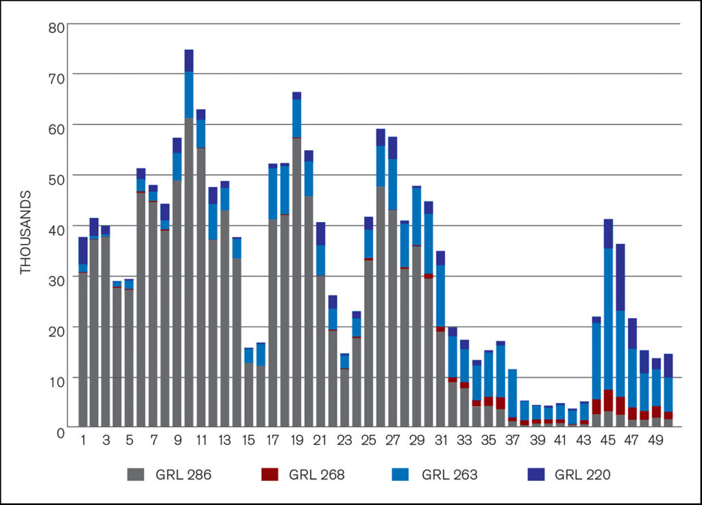 GRL 286K cars dominate among recent additions to the fleet because they enable operational efficiencies that reduce costs and ease logistics challenges. The fleet continues to add GRL 263K and GRL 268K cars, but at a much lower rate than GRL 286K cars. 2024 saw increases in GRL 220K cars added to the fleet for a third year of growth. The last year non-GRL 286K cars led among new additions to the fleet was 1992.