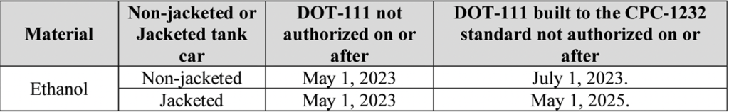 “DOT-111 specification tank cars (jacketed and non-jacketed) are not authorized for ethanol transportation on or after May 1, 2023. DOT-111 specification tank cars built to the CPC-1232 standard (non-jacketed) are not authorized for ethanol transportation on or after July 1, 2023. DOT-111 specification tank cars built to the CPC-1232 standard (jacketed) are not authorized for ethanol transportation on or after May 1, 2025.”
