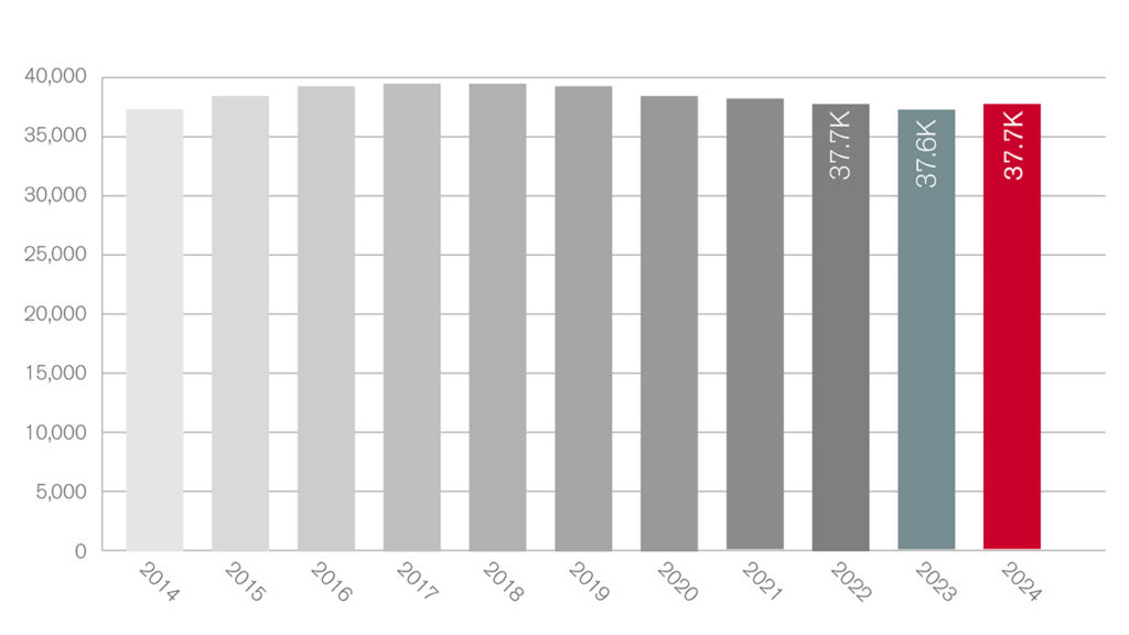 - Rebuilding programs continue but new locomotives are still rare. At the end of 2024, the locomotive fleet totaled 37,678, up 119 units from 2023. That is up from 2023’s –0.4% year-over-year decline.