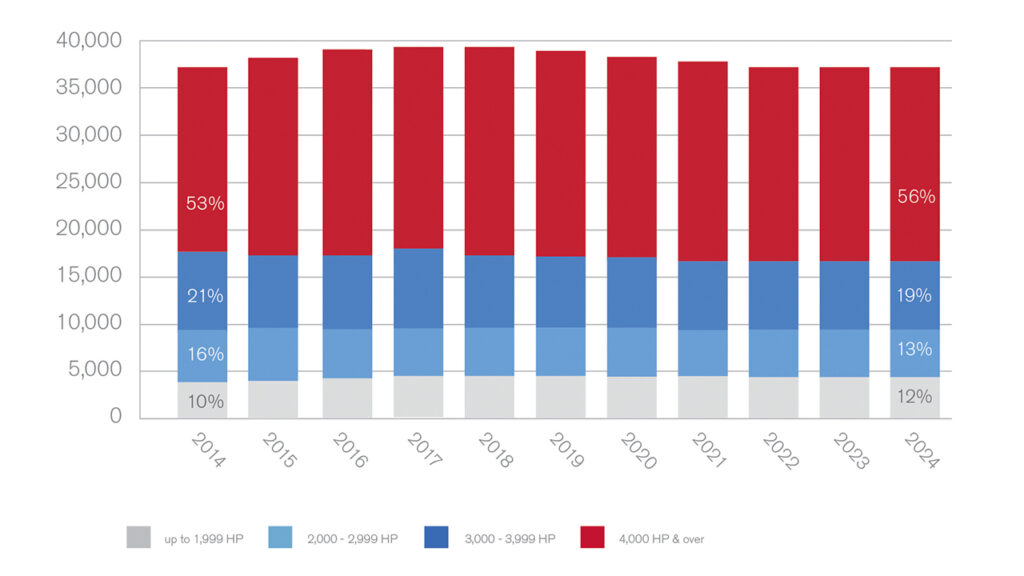 Locomotives with a horsepower rating of 4,000 or higher continue to make up most of the North American locomotive fleet. These locomotives comprised 56% of the fleet in 2024 (see Figure 4). Locomotives between 2,000 and 3,999 horsepower comprised 32% in 2024, down from 37% in 2014.