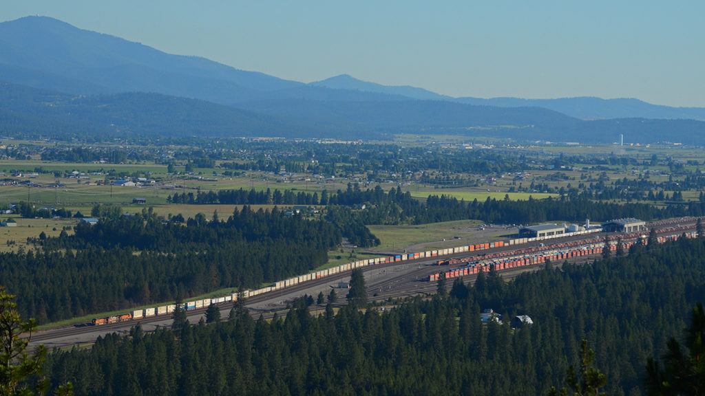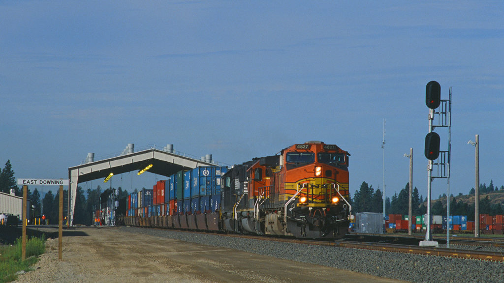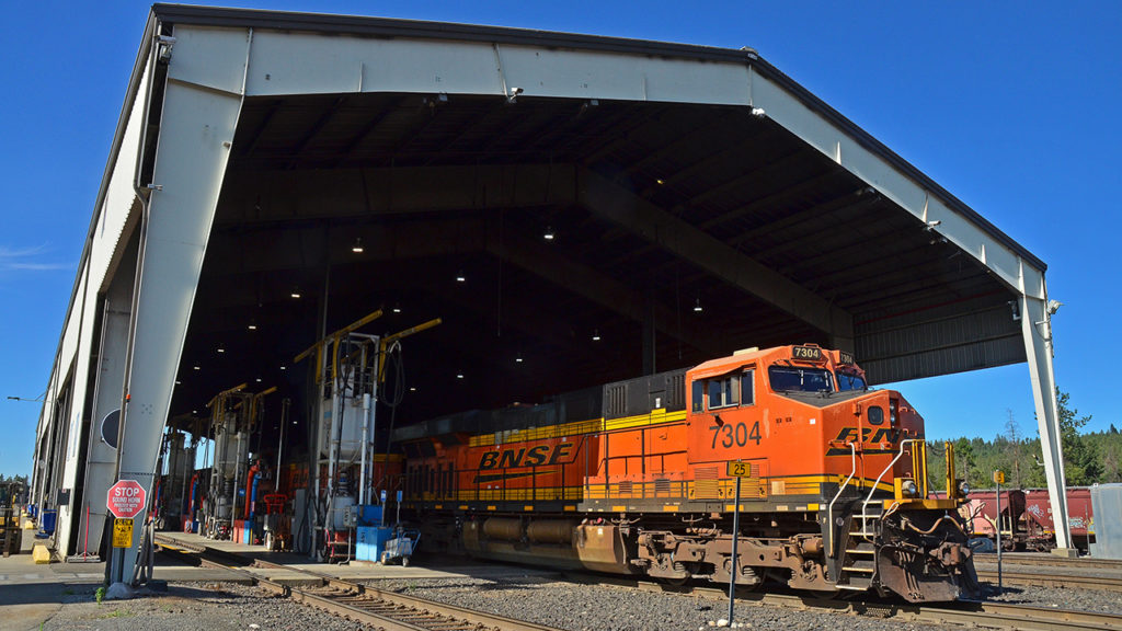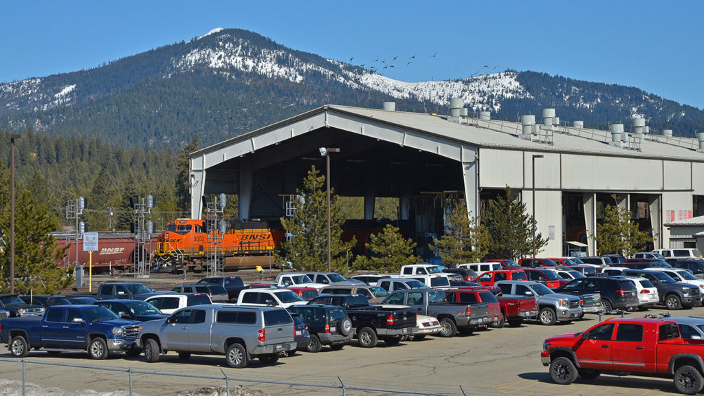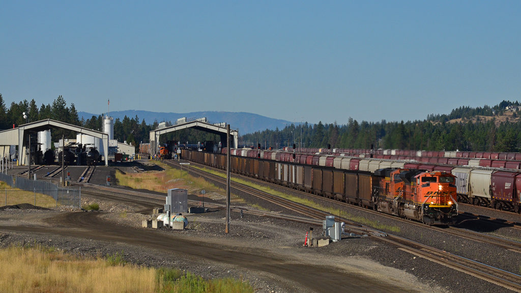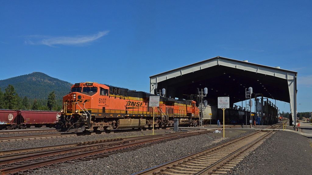 By the 1990s, Hauser saw increased use not just for unit grains trains being staged for arrival at Northwest ports but also for re-blocking or combining trains carrying intermodal and automobiles into and out of the region. Being situated near the middle of BNSF’s so-called “Funnel” between Spokane, Wash., and Sandpoint, Idaho, Hauser Yard became an increasingly important sorting point for traffic flowing on multiple routes to the east and west. BN halted further expansion of Hauser’s yard capacity, but BNSF recognized it as the perfect place to improve another part of its Northwest operations: locomotive servicing.