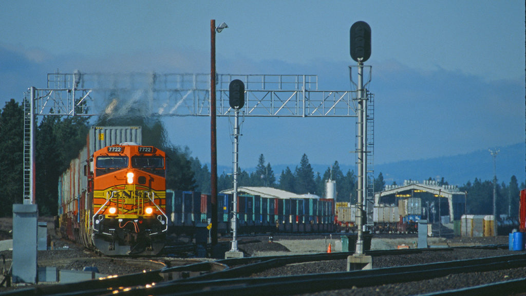 Hauser was a little-known staging yard during much of the 1970s and ’80s, but its importance grew following the Burlington Northern + Santa Fe merger in 1995. Just prior to the 1970 merging of Northern Pacific, Great Northern and other railways into BN, land was purchased adjacent to the NP main line at Hauser with the intention of building a new classification yard that would outperform older, smaller yards elsewhere in the Northwest. Tracklaying began at Hauser in 1972, but by the 1980s the facility had grown to no more than nine yard tracks (plus an additional track equipped for in-motion weighing of unit grain trains), far short of the 76-track yard that BN originally envisioned. The U.S. was in the midst of an economic recession, and BN had spent its first decade investing billions of dollars on post-merger improvements elsewhere across its system.