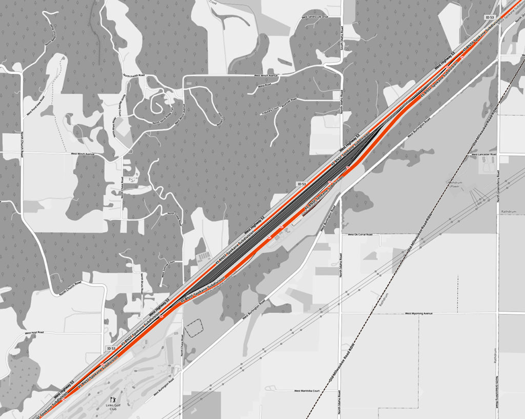 When first opened in 2004, the Hauser facility featured two run-through refueling tracks (Mains 4 and 5), plus a shorter track (Main 3) with limited access for servicing light power or short trains. A third run-through fueling track (Main 6) was added in 2006. In 2017, track was finally extended on both ends of Main 3, giving Hauser four full-length run-through refueling mains. Also in 2017, the refueling mains and yard leads at the east end of Hauser were reconfigured to accommodate occasional double-length trains. These trains are roughly two miles long and handle close to 220 cars, with locomotives at the front, middle, and rear. Main 6 now has enough added capacity at its east end to allow servicing of power at the middle and west end of a double-length train without fouling other tracks or blocking road crossings.