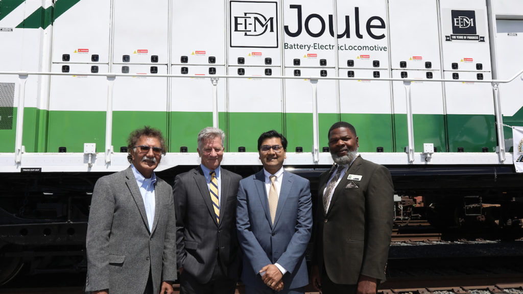 FRA Administrator Amit Bose, Anacostia Rail Holdings executives, and ports of Los Angeles and Long Beach officials on May 4 gathered to celebrate PHL’s latest group of locomotive engineer graduates to serve the San Pedro Port complex. They stand in front of Progress Rail’s zero-emission, zero-idle EMD® Joule battery-electric locomotive, which recently arrived to begin a year of railroad testing. (Photograph Courtesy of The Wolcott Group)