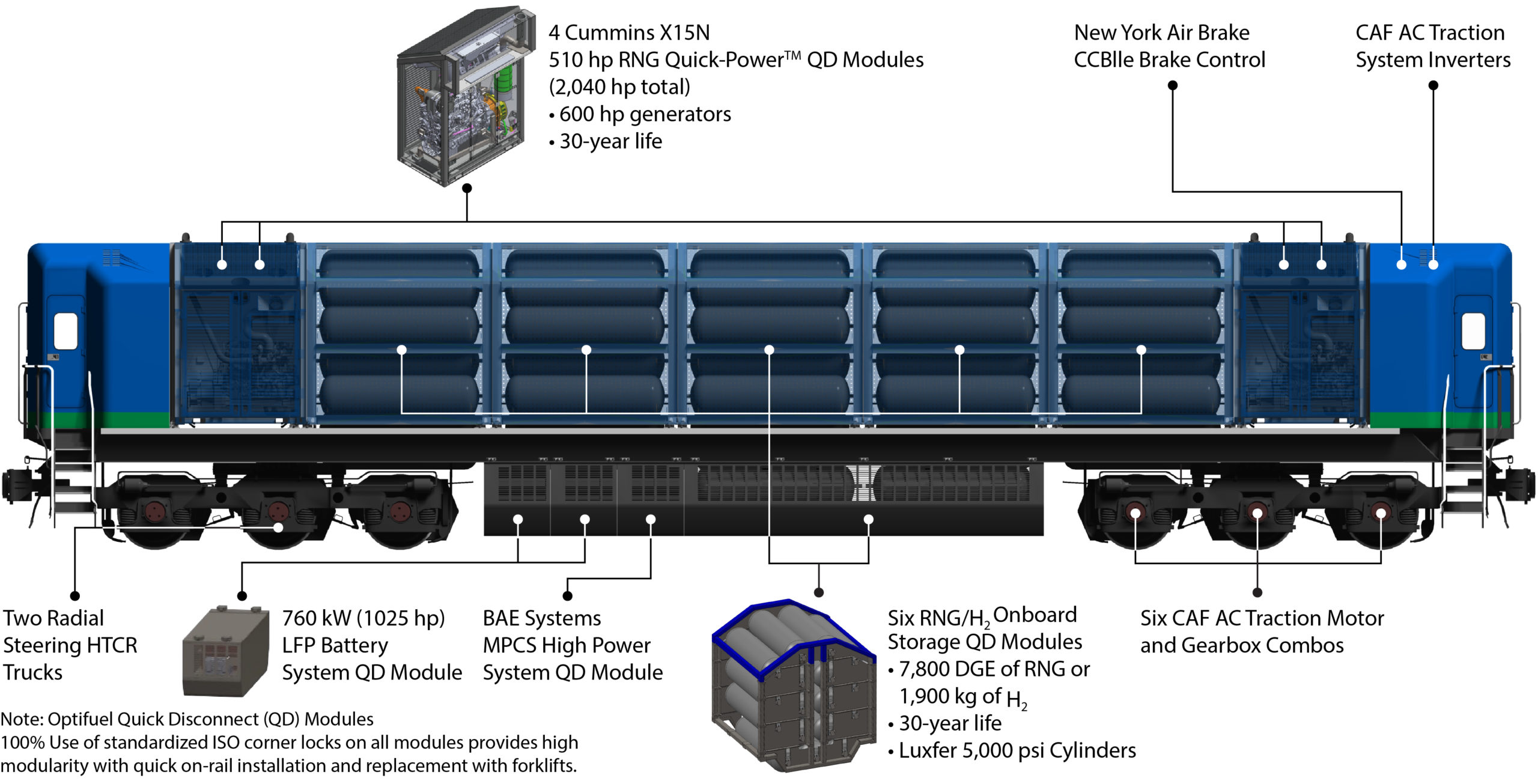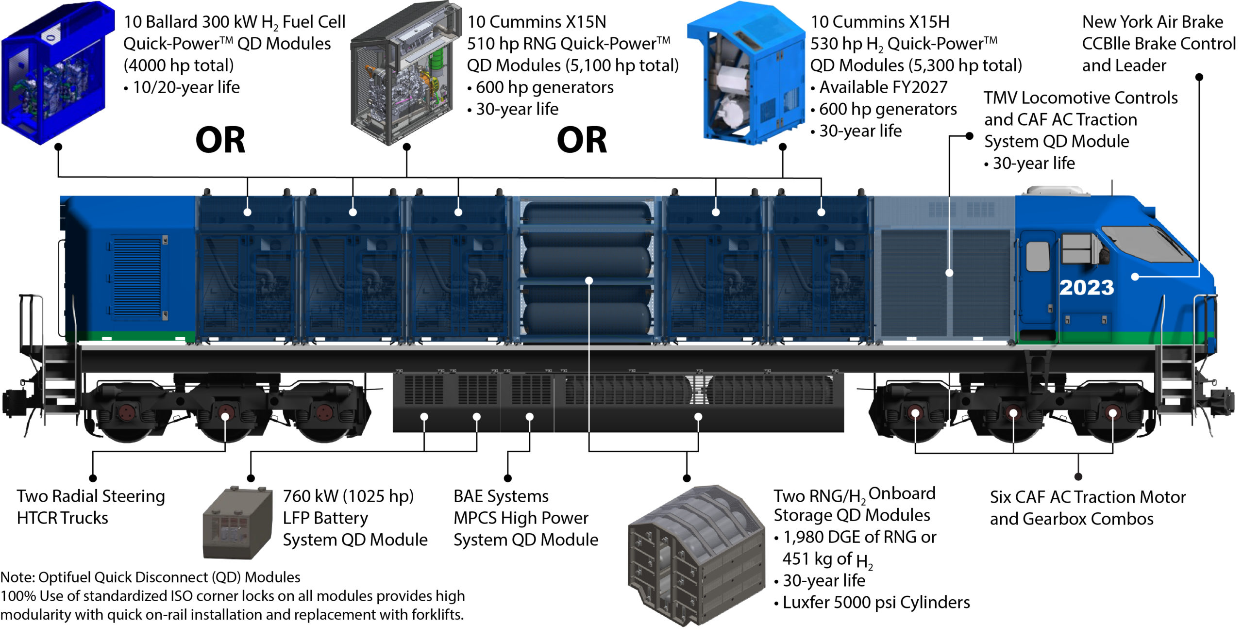 OptiFuel says it is “committed to spearheading the sustainable revolution with locomotives and refueling solutions that make fleet transitions affordable.” Unique to OptiFuel’s locomotive designs is the use of modularity consisting of standard Quick Disconnect (QD) modules using standardized ISO corner locks.