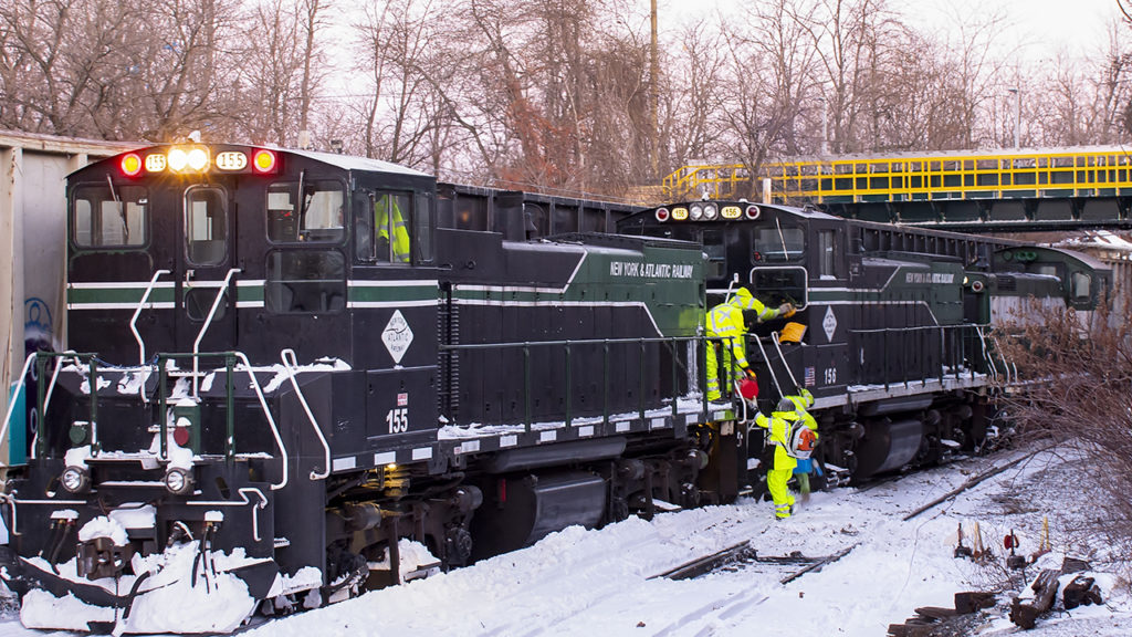 New York & Atlantic crews offloading switch cleaning equipment—snow shovel, backpack blower and fuel for switch heaters—at the Fresh Pond Yard, just west of the New York City Transit overpass. (Photo by Gregory Grice)