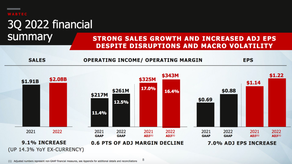 For the three months ended Sept. 30, 2022, Wabtec GAAP earnings per diluted share of $0.88 rose 27.5% from the third-quarter 2021’s $0.69; adjusted, they were $1.22, up 7.0% from $1.14. “GAAP and adjusted EPS increased from the year-ago quarter primarily due to higher sales and disciplined cost management,” Wabtec said. “GAAP EPS further benefited from lower restructuring and transaction costs.”