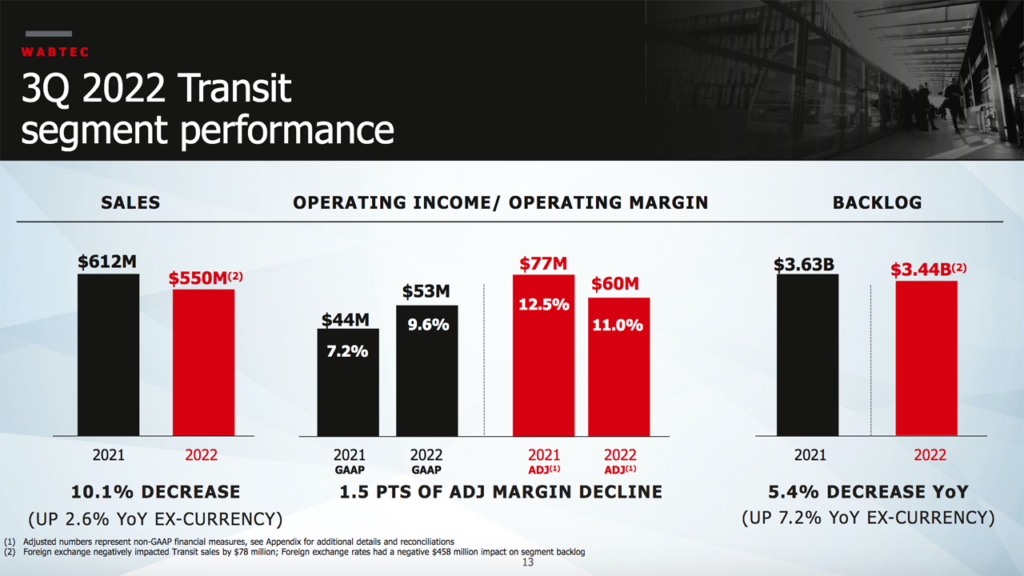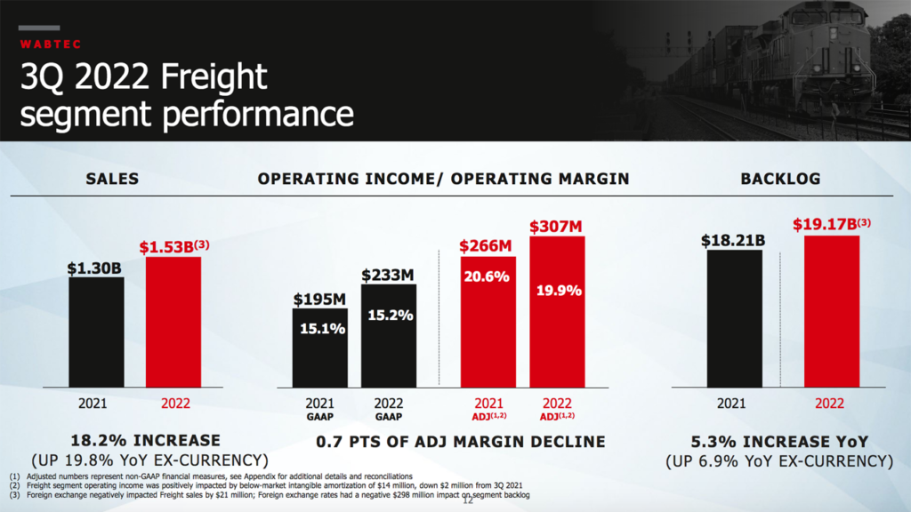 At Sept. 30, 2022, multi-year backlog was $0.77 billion higher than at Sept. 30, 2021, and “[e]xcluding unfavorable foreign currency exchange,” it was up $1.52 billion (or 7.0%), according to Wabtec.