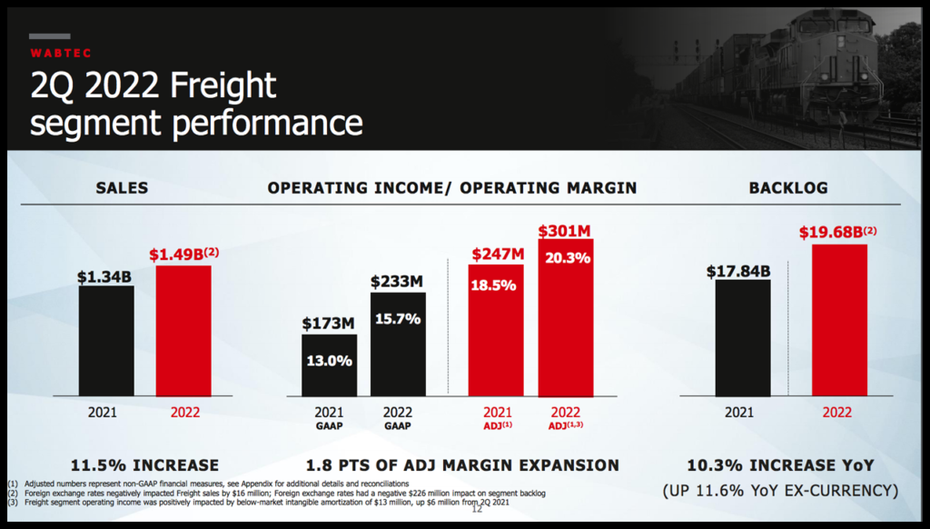 Wabtec Corp. delivered “strong” second-quarter 2022 financial results, with year-over-year growth in total sales (up 1.8%, carried by the Freight segment) and backlog (up 7.9%), despite “rising costs, continued supply chain challenges and significant unfavorable foreign currency exchange,” the company reported Aug. 5.