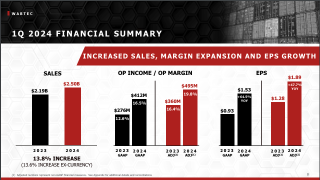 Wabtec updated its 2024 financial guidance with sales expected to be in a range of $10.25 billion to $10.55 billion and adjusted earnings per diluted share to be in a range of $7.00 to $7.40.