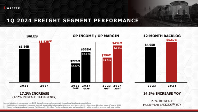 Freight segment sales for first-quarter 2024 were up 17.2%, “driven primarily by Equipment and Services,” according to Wabtec. “GAAP operating margin and adjusted operating margin benefited from higher sales, improved gross margin and focused cost management.”