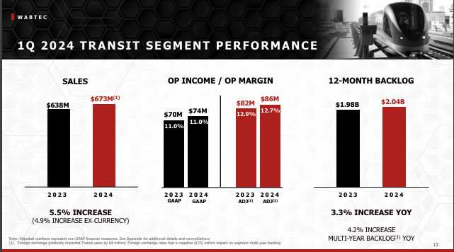 “The Wabtec team delivered a strong start to 2024, continuing the momentum experienced in 2023. This was evidenced by higher sales, margin expansion, and increased earnings in the quarter,” President and CEO Rafael Santana said in an April 24 earnings announcement. Sales were up 13.8% year-over-year, driven by sales growth in both the Freight and Transit segments.