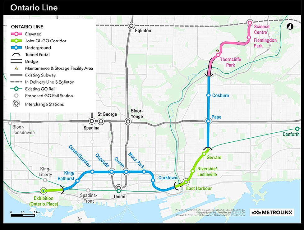 Going forward, Barr told Railway Age that Hitachi is hopeful the Connect 6ix consortium, of which it is a part, will be awarded the Rolling Stock, Systems, Operations and Maintenance (RSSOM) contract for the 9.7-mile (15.6-kilometer) Ontario Line, a planned Toronto Transit Commission (TTC) rapid transit line linking the Ontario Science Center and Exhibition/Ontario Place (see map below).