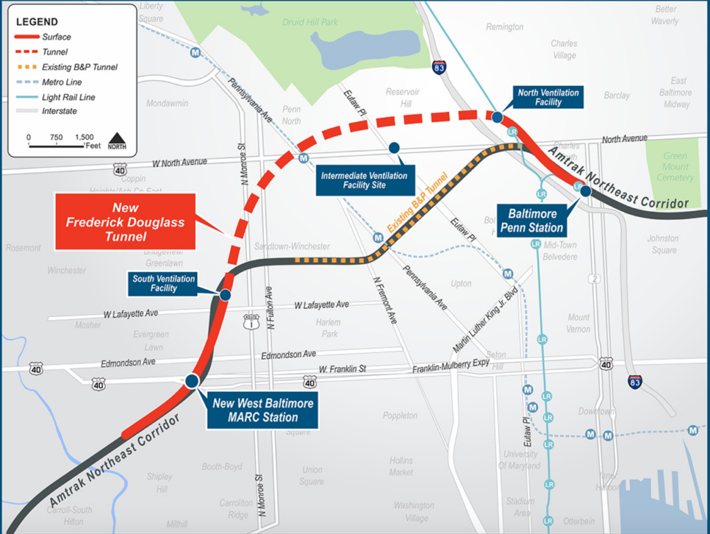The B&P Tunnel Replacement Program (the Program) will modernize and transform a four-mile section of the Northeast Corridor. It includes two new high-capacity tubes for electrified passenger trains, new roadway and railroad bridges, new rail systems and track, and a new ADA-accessible West Baltimore MARC station. (Amtrak map)