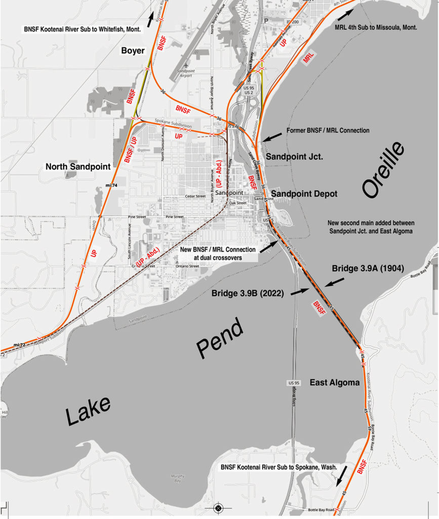 A four-year, multi-faceted project to widen a single-track chokepoint on BNSF’s Northern Corridor at Sandpoint, Idaho, is now complete, following the cutover of new track during a 16-hour work window on Aug. 6, 2023. What used to be two miles of single-track main line involving a bridge nearly a mile long over Lake Pend Oreille is now two main tracks with parallel bridges, plus an improved connection where BNSF’s Kootenai River Subdivision links up with Montana Rail Link.