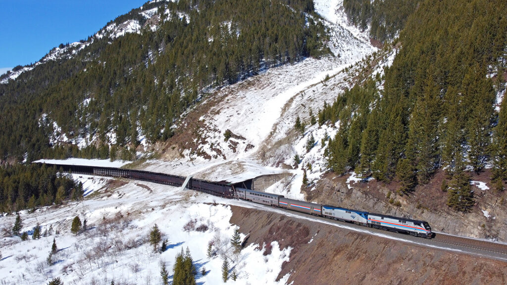 Amtrak’s Empire Builder passes through one of the ten snow sheds that protect BNSF Railway’s track over Marias Pass. The dirty snow on top of the shed and to the left of it are the remains of a slide that had come down the previous month. Photo by Justin Franz.