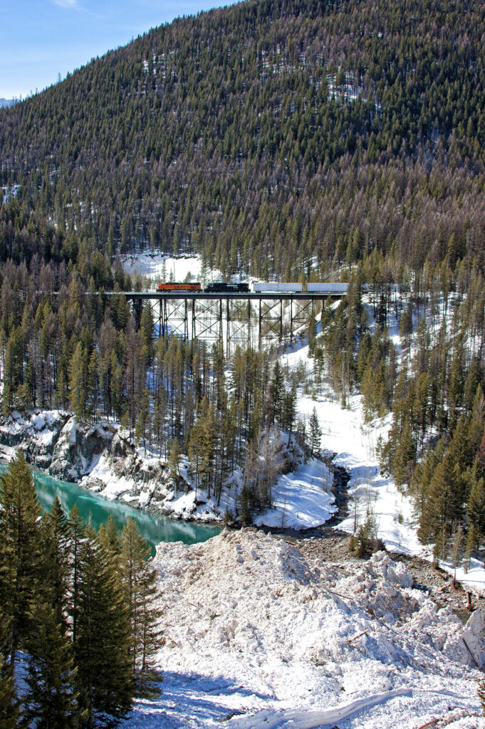 In March 2014, a series of avalanches slid down the side of John F. Stevens Canyon, east of Essex, Mont., impacting BNSF Railway operations. While this slide did not directly impact the right-of-way, it did briefly block the Flathead River. In the distance, a BNSF train is seen crossing Goat Lick Trestle. Photo by Justin Franz