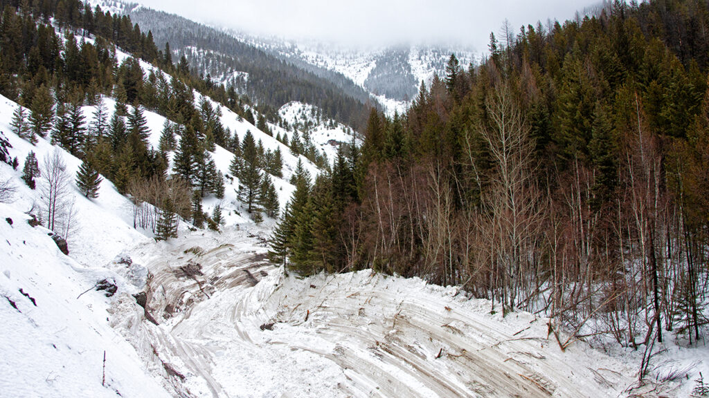The slide path of one of the avalanches that occurred in March 2014, east of Essex, Mont. The slide was powerful enough to uproot trees and scrape off the topsoil. Photo by Justin Franz.