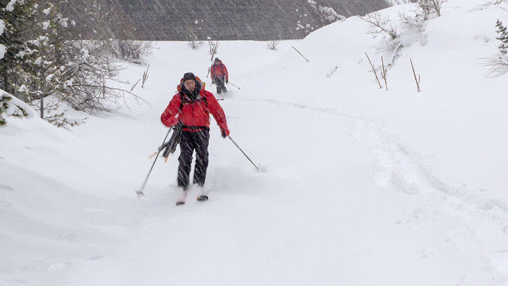 Members of the BNSF avalanche team are seen skiing down from one of the snow sheds on Marias Pass. Courtesy of BNSF Railway.