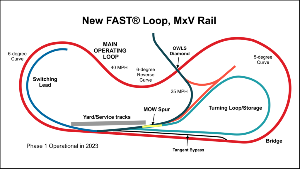 The fastener test zones at MxV Rail’s new Facility for Accelerated Service Testing (FAST®) Loop include various designs and configurations of tie plates, fasteners, spikes, and anchors, according to Principal Investigator Yin Gao. To evaluate performance in a challenging environment, Gao says the fastener test zones have been installed on a six-degree curve with a five-inch superelevation and experience tonnage accumulation from a train of loaded 315,000-pound GRL cars operating at 40 mph. The test zones see more than 140 MGT from the 18,000-ton train annually.