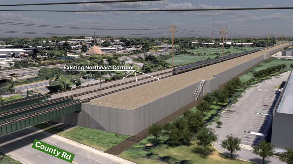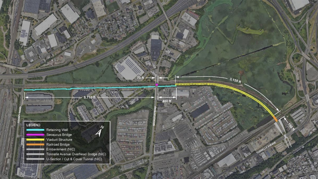 On Nov. 19, GDC reported releasing a Request for Qualifications (RFQ) for the project that involves building approximately 7,540 feet of above-ground viaduct and berm trackway adjacent to the Northeast Corridor (NEC), which the Commission said will enable the construction of new tracks connecting the existing NEC tracks in New Jersey to the entrance to the new Hudson Tunnel (see map above). The project’s scope of work encompasses designing and building new trackway infrastructure, including retaining walls, a new viaduct, bridges, and an access road, as well as relocating overhead electric, gas, and communication lines (see renderings below). This project does not include building new railroad systems, such as new track and signals. GDC said it will award the contract for that work via future solicitations.