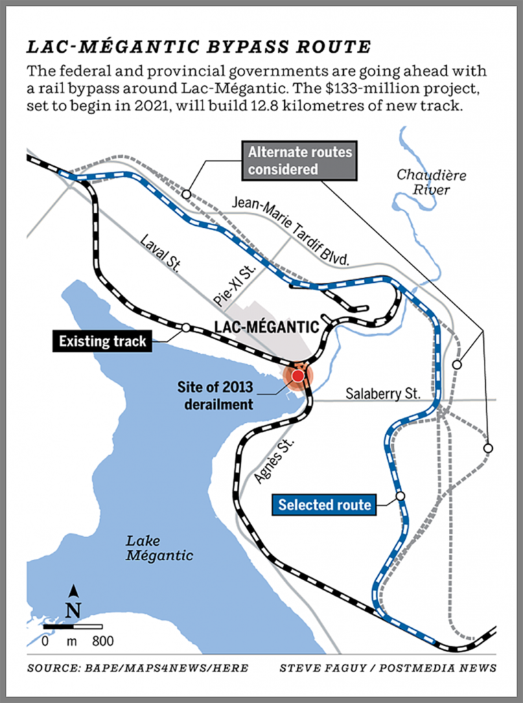 The rail bypass project requires Canadian Transportation Agency approval in accordance with Section 98 of the Canada Transportation Act. An application for approval has been filed. The chosen route “will ensure that trains leave downtown Lac-Mégantic for good,” said Transport Canada. “This route was recognized as the most advantageous one by the Quebec BAPE (Bureau d’audiences publiques sur l’environnement) in 2019 and as the one with the least impact on agricultural land by the PTAQC (Commission de protection du territoire agricole du Québec) in 2020. Since the 2013 tragedy, Transport Canada has considerably strengthened its oversight program and has put in place stricter measures and requirements to protect communities that live along rail lines through regulatory and legislative reform.”