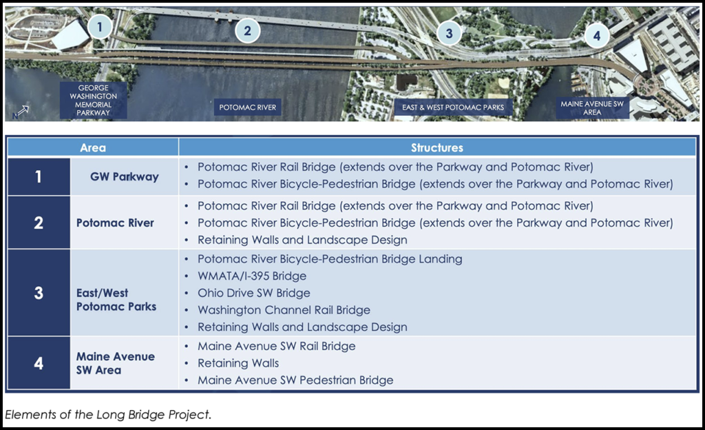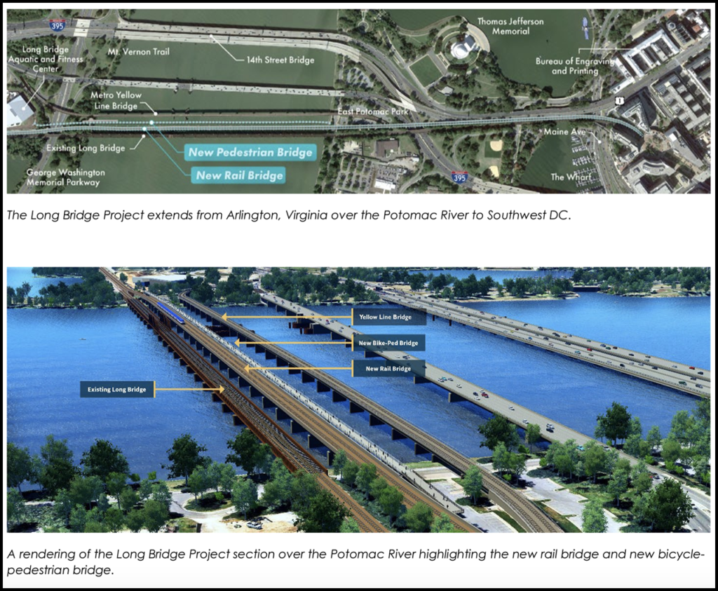 The Long Bridge Project will also create a bicycle and pedestrian bridge over the river, connecting Arlington’s Long Bridge Park and the Mount Vernon Trail to the District’s East and West Potomac parks. Additional elements along the 1.8-mile project corridor include improvements to five other bridges and related railroad infrastructure (see above).