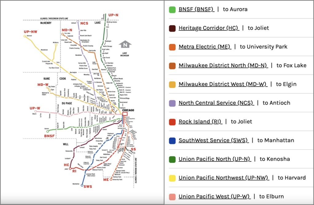 With a service area encompassing more than 3,700 square miles, Metra offers 243 stations across its 11 commuter rail lines. On March 10, it launched a survey and scheduled public outreach events to ask riders what they think about potentially renaming lines to make the system easier to understand and to encourage infrequent and first-time riders to ride more often. (Map and Key Courtesy of Metra)