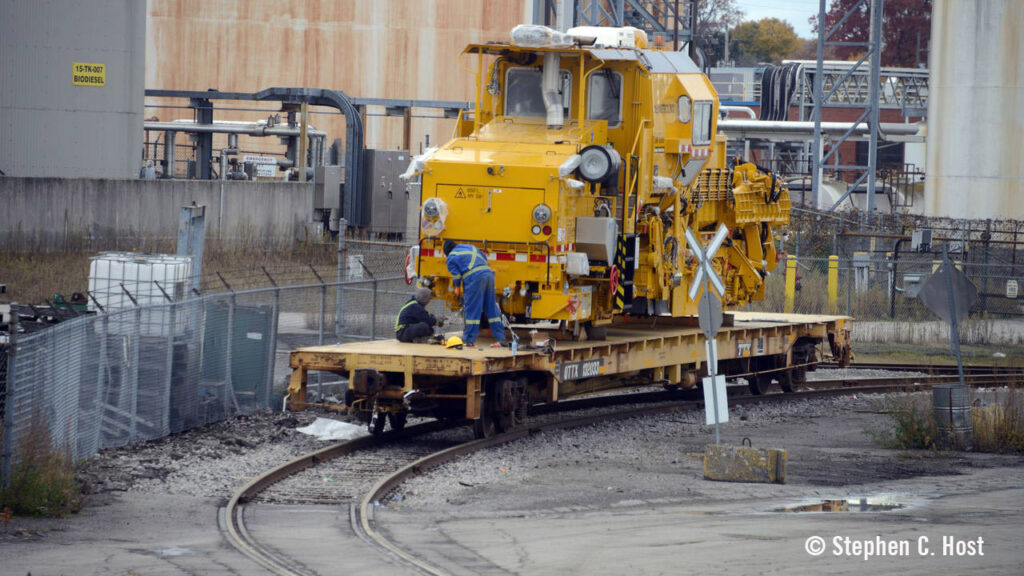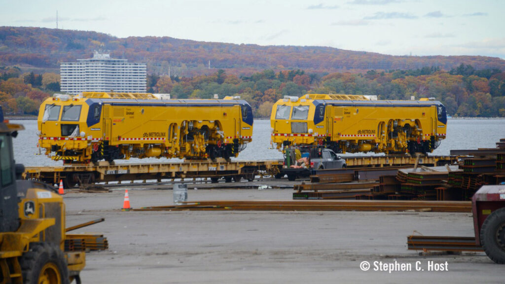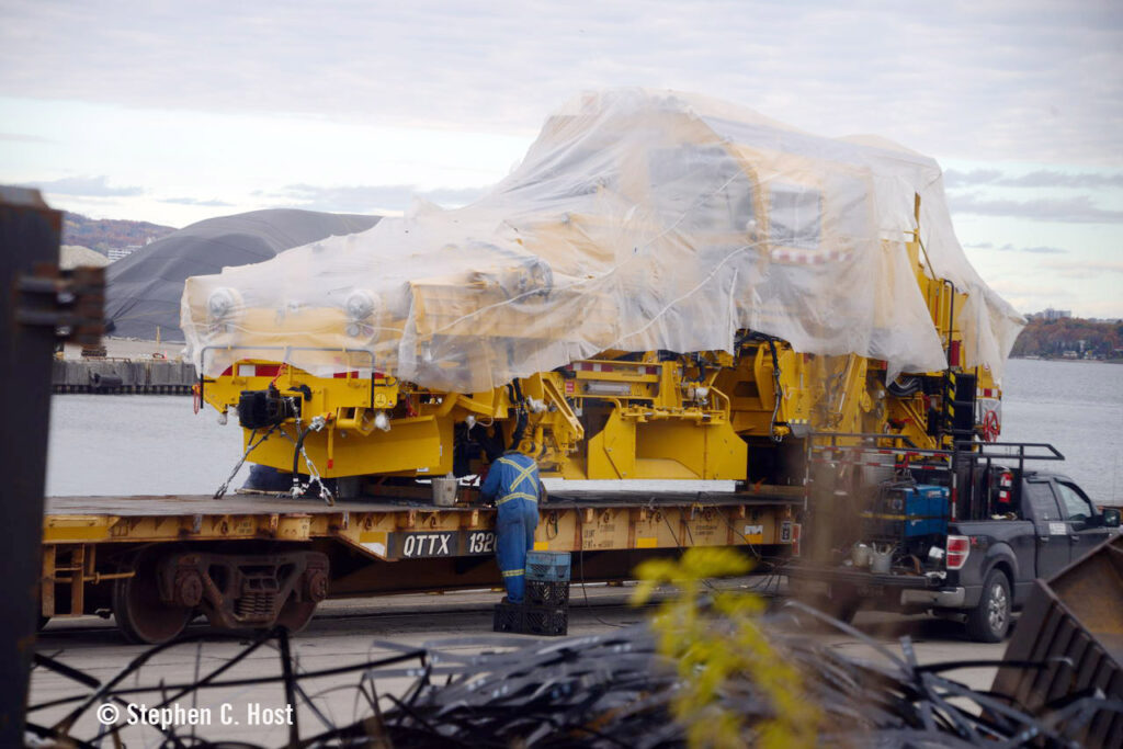 A large order of Plasser American maintenance-of way-equipment arrived in Canada on Nov. 6. Offloaded from a ship at the Port of Hamilton/Federal Marine Terminals Pier 14, the equipment was rigged up for transport on QTTX flatcars for delivery to Metrolinx facilities in the Greater Toronto/Hamilton area Nov. 8.