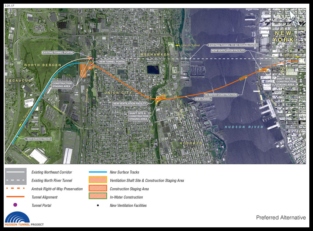 The Hudson Tunnel project, valued at some $12.3 billion, includes construction of a new two-track rail tunnel along the NEC from the Bergen Palisades in New Jersey to Manhattan that will directly serve Penn Station New York. It consists of three major elements: the Hudson Yards right-of-way preservation project, a new Hudson Tunnel, and the rehabilitation and modernization of the existing North River tunnel (see map below).