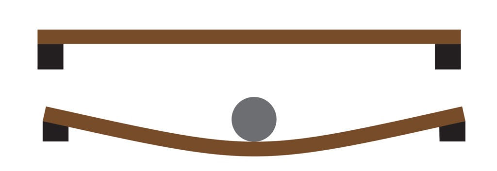 Figure 2 (above) shows drawings of a beam that is supported by blocks at each end. In Figure 2-A, the beam is not loaded. In Figure 2-B, the beam bends under a load applied at its center, and its supports also deform. The bend in the beam and deformation of its supports are measurable on a global scale. The stiffness of a structure is a measure of the amount of load that is required to cause a certain amount of displacement. A structure with a high level of stiffness will deform less than a structure with a lower level of stiffness.