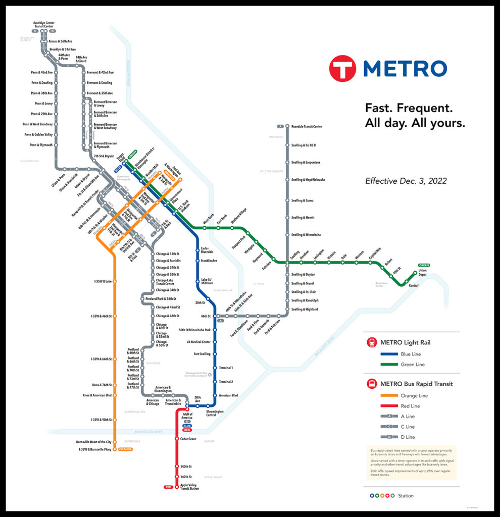 The system’s two light rail lines share five stations in downtown Minneapolis, from Target Field to US Bank Station. They split east of there, with the Blue Line going in a southerly direction toward the Mall and the Green Line going in an easterly direction toward Saint Paul.