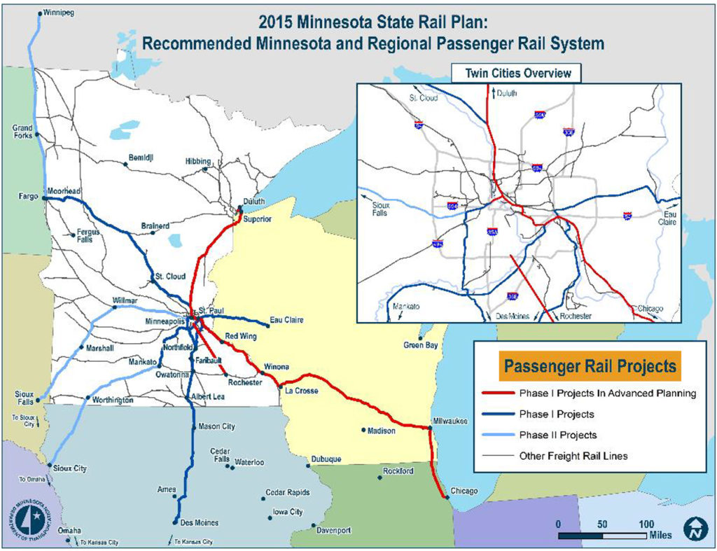 An ambitious State Rail Plan from 2015 (download below) proposed a number of corridor-length routes for passenger trains throughout much of Minnesota and into neighboring states that, if service is established, would create a number of mobility opportunities for non-motorists and motorists alike. Three projects were in advanced planning at the time: a second frequency between Chicago and the Twin Cities, service to Duluth, and service to Rochester, home of the Mayo Clinic. Other projects within a 20-year planning frontier included service to Albert Lea and Des Moines, Mankato, Fargo/Moorhead, and Eau Claire, Wisc. Plans beyond the 20-year frontier included service to Sioux Falls, S.Dak., an extension from Mankato to Sioux City, Iowa, and an extension northward form Fargo/Moorhead to Winnipeg, Manitoba.