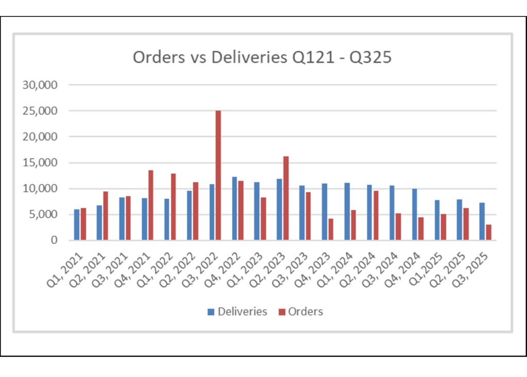 Orders for new railcars in 2025’s third quarter amounted to 3,071. We’re not facing a financial crisis, or a COVID lockdown, but orders are behaving as though we’re in a crisis. This is a travesty with potential harm to the industry over the next few years.